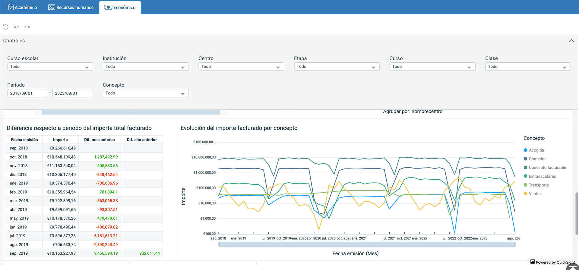 En el panel Económico, puedes consultar y exportar datos sobre la información económica de la institución como la facturación o el estado de los recibos, a través de los filtros para llevar a cabo una gestión analítica financiera completa: