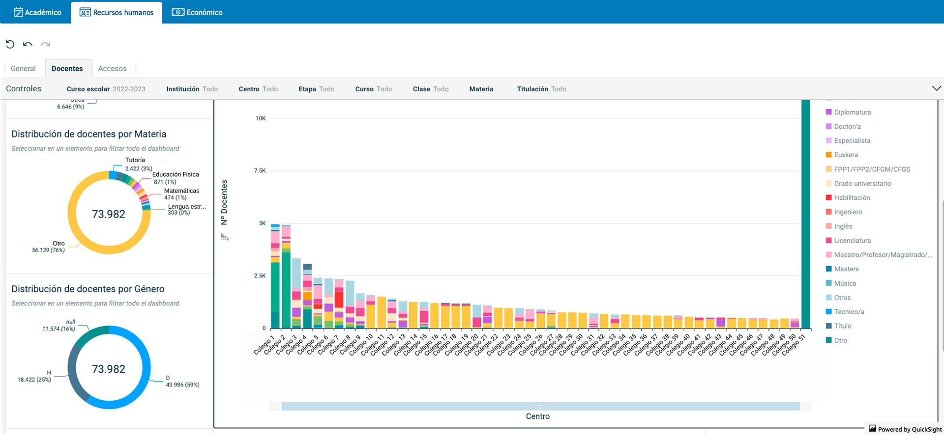 En el panel de Recursos humanos, puedes consultar y exportar datos generales sobre los trabajadores de la institución, más allá de los docentes. Los filtros que se pueden aplicar en este espacio son: